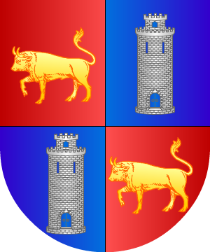 y 4º, de gules, un toro pasante de oro, y 2º y 3º, de azur, una