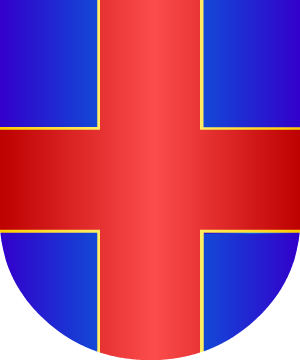 esta forma: Escudo cortado: la partición alta de oro, con el tao de gules,