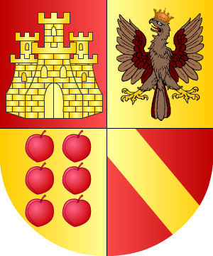 un cirio de plata ardiendo. 32.- Otros Bernales: En campo de plata, una cruz, de sable. 33.- Los Bernáldez, de Mansilla (La Rioja) y radicados en Torrijos (Toledo), traen: En campo de oro, dos calderas, de sable, puestas en palo. 34.- Los Bernáldez, radicados en Venezuela, traen: En campo de plata, un salmón, saltante, de azur. Bordura de gules, con ocho estrellas de seis puntas, de oro. 35.- Los Vernal, radicados en Madrid, según Vicente de Cadenas, traen: Escudo contrapalado de oro y gules. 36.- Los Bernat, de Barcelona, usan: Escudo bandado de cuatro piezas de plata y cuatro de gules. 37.- Otros Bernat: Un pez sobre ondas. 38.- Los apellidados Bernal de los Ríos, radicados en Madrid, usan: Escudo partido: 1º, en campo de gules, y 2º, en campo de plata, trece roeles de azur, puestos como orla. 39.- Los Bernales de Navarra, según Rietstap: En campo de gules, una vela de plata, encendida de gules, cayendo la cera por el lado siniestro. Información de estos linajes complementada por cortesía de blasonari.net |
