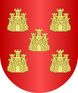 de sinople, puestas en sotuer; 2º y 3º, de gules, con un castillo
