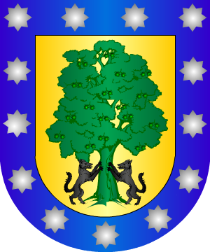 cuartelado: 1º, una encina y al pie un lobo atado a una cadena; 2º,