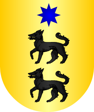 oro y a su puerta un lebrel manchado de plata y sable. Bordura de gules con