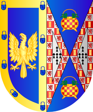 Cuadra Quadra Vasco, del barrio de su nombre en el ayuntamiento de Musques, partido judicial de Valmaseda (Vizcaya). Una rama pasó a Chile Probó su nobleza repetidas veces en las distintas Órdenes Militares. Armas 1.- Cuartelado, 1º de gules, tres fajas de oro, y bordura de plata con cuatro cruces de oro (en contra de las leyes heráldicas); 2º de plata, un roble de sinople y dos lobos pasantes de sable al pie del tronco, y bordura de oro con ocho aspas de azur; 3º de gules, una banda de oro engolada de dragantes de sinople; y 4º cuartelado, 1º y 4º de plata, un jabalí rampante de su color, y 2º y 3º de plata, tres estrellas de oro bien ordenadas. 2.- Los marqueses de Villerías traen: escudo partido, 1º de azur, tres barras de plata; y 2º de oro, una cruz flordelisada de gules. Bordura de plata con ocho aspas de gules. |