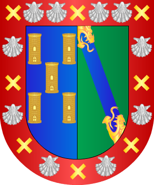 6.- Los de Castilla, según Francisco Fernández de Béthencourt, y los de Canarias, Jaén y Murcia, usan: En campo de gules, cinco torres de oro, puestas en sotuer. Dichas armas constan en la iglesia de Santa María de la Fuente, de Guadalajara.