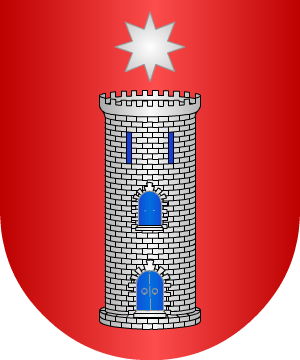 de gules, un castillo de oro, aclarado de azur, y 2º y 3º, en campo