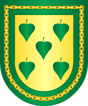 rombo dos palos de oro y en la partición baja, en campo de plata, cinco