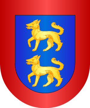 de azur, con tres fajas ondeadas de oro y bordura de oro, con cuatro cabezas