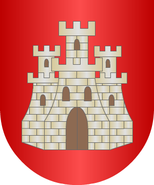 gules, con un castillo de plata aclarado de azur, en cuyo homenaje tiene una
