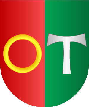 traen: En campo de gules, un león de oro, fajado de azur. Bordura de