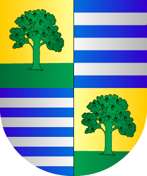 con las ocho arandelas de lanza, de azur. 7.- Los de Galicia, usan: Escudo partido: 1º, en campo de plata, un león de gules, rampante, por concesión del Rey Don Enrique IV de Castilla, y 2º, en campo de gules, una torre sobre un puente, que bañan ondas de agua de azur y plata; bordura general de oro, con ocho arandelas de azur. 8.- La casa de Durango, ostentaba: Escudo partido: 1º, en campo de plata, un león de gules, rampante, por concesión del Rey Don Enrique IV de Castilla, y 2º, en campo de gules, un castillo sobre un puente, que bañan ondas de agua de azur y plata; bordura general de oro, con ocho arandelas de azur. 9.- Los de León, descendientes de los Sarmiento por línea femenina, según Diego de Soto y Aguilar, traen: Escudo partido: 1º, en campo de plata, un león rampante de oro, y 2º, en campo de gules, sobre ondas de mar de azur y plata, un puente de plata sumado de un castillo, también de plata; bordura de oro con ocho roeles de azur. 10.- Los de Úbeda, según Alonso Fernández de Madrid, usaron: Escudo partido: 1º, de plata, con un león rampante, de púrpura; 2º, de gules, con una torre, de plata, con puente de hierro, puesta sobre un puente de tres arcos, y debajo del puente, sin agua, una rama de romero; bordura de oro, con ocho arandelas de lanza, de azur. 11.- Otros Aranda, traen: En campo de plata, un león rampante de gules, que son las armas reales que concedió Don Enrique IV al Jurado Fernando de Aranda. Este mismo escudo usaron los Aranda de Aragón, Navarra y Andalucía. 12.- Los Aranda de Cabra (Córdoba) traen: En campo de oro, una banda de gules. 13.- Buegas dice que hubo también Aranda que ostentaron estas otras armas: En campo de oro, una banda de gules, cargada de tres flores de lis de azur y acompañada en lo alto, de un león rampante, de gules, y en lo bajo, de un castillo de azur. 14.- En el puente de Anuncibay, de Orozco, que mandó construir Ignacio de Aranda y Novia de Salcedo, Marqués de Falces, en 1741, consta este otro escudo: Escudo partido: 1º, una torre con bandera en las almenas, puesta sobre un puente, y a su vera un romero, y 2º, cortado: primero, un león rampante, y segundo, un brazo armado con una bandera hacia abajo; bordura general con ocho arandelas. 15.- Los originarios de Asturias, radicados en Oviedo, León y Madrid, según Vicente de Cadenas, traen: En campo de gules, un guerrero de plata, con un estandarte en la diestra y una maza, de guerra, en la siniestra. 16.- Miguel de Salazar, para la casa de Aranda de Duero (Burgos), las describe de esta forma: En gules, una torre de plata, cercada de un muro del mismo metal, aclarada de azur, sobre un puente de tres arcos, y debajo de él una mata de romero, de sinople, sobre ondas de agua de azur y plata. Bordura de oro, con ocho hierros de lanza, de azur. 17.- Otros: Escudo mantelado: 1º, en azur, una estrella de oro; 2º, una cruz de gules, como la de Portugal; 3º o manteladura, en azur, un mundo con un rey de oro y un castillo de plata. Bordura general de gules, con ocho aspas de oro. 18.- Otros Aranda establecidos en Limbourg (Países Bajos) usan: En campo de azur, una torre de tres cuerpos de plata, aclarado de gules. Bordura de oro, con ocho aspas de gules. 19.- Otros Aranda o Arandas radicados en Brujas (Flandes-Bélgica) usaron: Escudo cortado: 1º, a su vez partido: primero, en campo de azur, una estrella de ocho puntas de plata, y segundo, en oro, una cruz flordelisada de gules, y 2º, en campo de plata, un mundo de azur, alado de lo mismo, cintado de oro, y superado de una cruz de lo mismo. Información de estos linajes complementada por cortesía de blasonari.net |