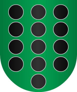 Escudo partido: 1º, de oro, con los trece roeles de azur, y 2º, de