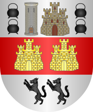 un castillo, de plata, mazonado de sable y aclarado de azur. Jefe con tres estrellas