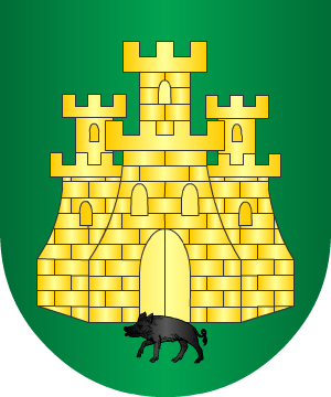 En campo de gules, una cueva de plata, por la que saca medio cuerpo un león