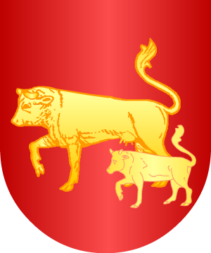 Otros invierten los esmaltes del anterior escudo, poniendo en campo de oro, con las fajas y la tau de gules. (Ref.: CRESPO DEL POZO) |