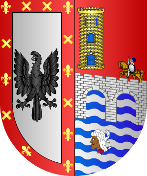 En plata, dos llaves, de oro, atadas con una cinta de gules. (Ref.: CADENAS) |