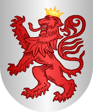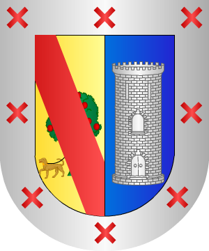 a cada lado un león rampante de oro. Bordura de oro con ocho sotueres