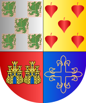 a cada lado un león rampante de oro. Bordura de oro con ocho sotueres
