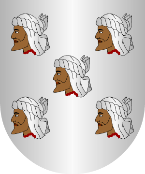 Valenciano. De Jijona. En azur, un árbol al natural y un león de oro, echado delante del tronco, sumado de un águila, también de oro, que está delante del tronco, entre el león y la copa del árbol;, sobre ésta, otra águila más pequeña, también de oro; al lado derecho del árbol, cinco flores de lis, de oro, en aspa, y al lado izquierdo, cinco menguantes del mismo metal, también en aspa. Bordura con la mitad derecha de oro, con ocho aspas de gules, y la mitad izquierda de gules, con ocho veneras de oro. D'azur, à un arbre terrassé de sinople, accompagné d'un lion couché d'or, brochant sur le pied du fût, et d'une aigle d'or, brochant sur le milieu du fût, le feuillage de l'arbre chargé d'une autre aigle d'or, l'aigle sur le fût adextrée de cinq fleurs-de-lis d'or, 2, 1 et 2, et senestrée de cinq croissants versés du même, 2, 1 et 2, à la bordure partie d'or et de gueules, l'or chargé de huit flanchis de gueules et le gueules de huit coquilles d'or. (Ref.: GARCIA CARRAFA), (ref.: ATIENZA), (ref.: GONZALEZ-DORIA), (ref.: CADENAS), (ref.: RIETSTAP). |