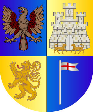 Goicoechea Goycoechea Linaje vasconavarro. Probó su nobleza en las Órdenes de Santiago y Carlos III, así como en la Real Compañía de Guardias Marinas. Armas 1.- Los de Guipúzcoa y Vizcaya traen: Cortado, 1º de azur, un grifo de oro; y 2º de plata, una encina de sinople frutada de oro y empinado al tronco, un jabalí de sable. Bordura de gules con ocho aspas de oro. 2.- Otros de Vizcaya traen: De plata, una encina de sinople frutada de oro, acostado de dos jabalíes de sable empinados a su tronco. 3.- Los de Deva traen: Partido, 1º de oro, un pino de sinople; y 2º de sinople, un cabrio de plata. 4.- Los de Navarra traen: Cuartelado, 1º de azur, un águila al natural; 2º de oro, un castillo con dos lebreles afrontados guardando su puerta; 3º de oro, un león; y 4º de azur, una bandera de plata cargada con una cruz de gules. 5.- Otros traen: De oro, una rueda de gules acompañada a la diestra de una casa al natural, y a la siniestra de una torre de sable a la que se le acerca un guerrero portando una bandera de gules. |