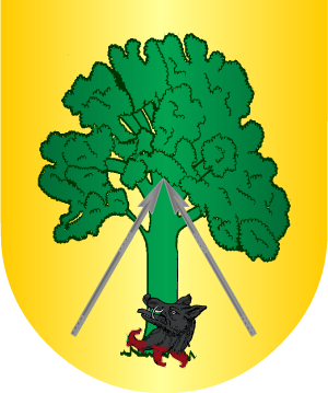 Armas En oro, un árbol de sinople, con dos lanzas apoyadas en el tronco, una a cada lado; en punta, al pie del árbol, una cabeza de jabalí, de sable, chorreando sangre. (ref.: CADENAS). |