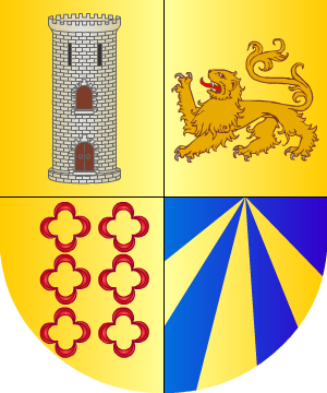 En azur, una banda de oro, engolada en cabezas de dragones de lo mismo, y acompañada de dos calderas de sable, perfiladas en oro, una a cada lado. (Ref.: CADENAS) |