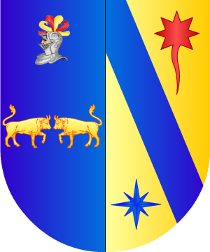 de oro, saliente del flanco siniestro en una nube, un brazo vestido de azur,
