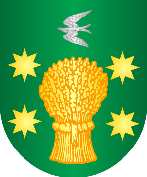 de azur, una banda de oro, acompañada de dos estrellas del mismo metal,