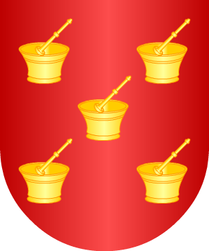El Cronista y Rey de Armas Vicente de Cadenas recoge este apellido en el Repertorio de Blasones de la Comunidad Hispánica. Armas 1.- En azur, cinco morteros, de oro, puestos en aspa. 2.- Otros: En sinople, una bandera, de oro, con una media luna, de plata. Información de estos linajes por cortesía de blasonari.net |