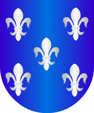 campo de plata, una banda de gules, cargada de tres flores de lis de oro, y