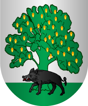 de oro, coronado del mismo metal y colocado bajo la puerta. Bordura de plata,