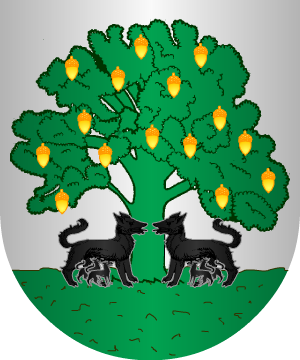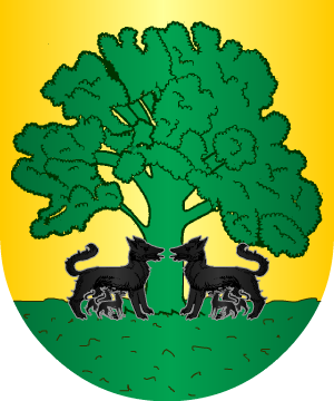 de plata, un árbol de sinople con un lobo de sable, pasante al pie del