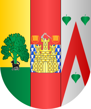 con un jabalí de sable pasante al pie del tronco. Bordura de gules, con