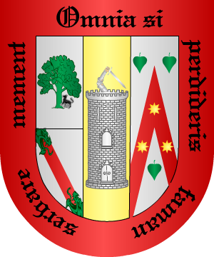 de sable, y un lebrel asido a una oreja del puerco-espín. 79.- Otros de Navarra, traen: Escudo de oro y tres palomas de sable, con el pico de plata. Bordura anglesada de azur. 80.- Otros: En campo de gules, una cruz vana y floreteada, de oro, acompañada de cuatro veneras de plata. 81.- Otros: En campo de oro, una faja, de gules, cargada de tres panelas de oro. 82.- Otros: En campo de plata, una banda, de azur y saliendo de ella, un guerrero, de oro con una espada en la mano. 83.- Los Aguirre, de Baquio y Arrieta, según una certificación de José Alfonso de Guerra y Villegas a favor de Juan de Solozábal, residente en la Puebla de los Angeles: En gules, una cruz vana y floreteada, acompañada de cuatro panelas de sinople. 84.- Otros: Escudo cortado: 1º, en campo de azur, cuatro dados, de plata, uno en cada cantón, y 2º, en campo de gules, un león pasante de oro y otros siete dados de plata puestas en la punta. 85.- Otros: Escudo cortado: 1º, jaquelado de sable y plata, de quince piezas, y 2º, en oro, una banda, de gules, acompañada en lo alto y en lo bajo de dos estrellas, también de gules. 86.- Francisco y Antonio Gómez de Arévalo señalan que el anterior escudo es de esta forma: En campo de gules, una cruz vana y floreteada de oro, acompañada de cuatro panelas de plata, una en cada hueco. Lema: "Reveladas y ganadas". Información de estos linajes complementada por cortesía de blasonari.net |