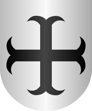 usan: Escudo de gules, con una cruz flordelisada, de oro, y cantonada de cuatro