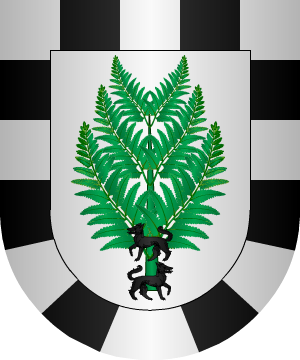 engolada en cabezas de dragones de sinople y acompañada de dos lobos