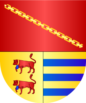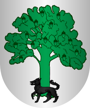 16.- Otros: En campo de oro, dos lobos andantes, de sable, uno sobre otro. Bordura de gules, con una cadena de oro de ocho eslabones.