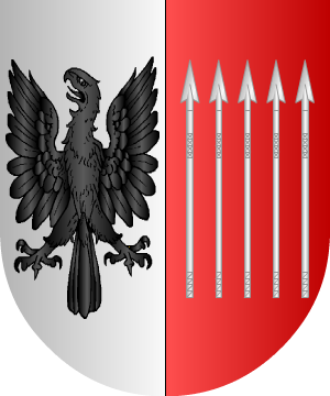un creciente jaquelado de oro y sable. 4.- Otros traen: En campo de oro un medio vuelo de azur surmontado por una estrella del mismo color. 5.- En campo de azur medio vuelo bajado y contornado de oro y sobre ondas de plata y azur. Bordura de ocho compones de oro. 6.-Los de las casas de Lérida y Tortosa usan: Escudo de azur, con una flor de lis de oro y cuatro crecientes de plata, apuntados al centro. En el jefe seis estrellas de plata, cuatro en faja y las otras dos bajo los extremos de ésta. 7.- Otros, en Aragón, traen: Escudo partido: 1º, en campo de plata, un águila de sable, y 2°, en campo de gules, cinco lanzas de plata. 8.- Otros de Aragón, según J.-B. Rietstap, traen: En campo de plata, medio vuelo de azur, puesto en faja. 9.- Los de Burgos, según Vicente de Cadenas: Escudo cortado: 1º, en campo de azur, un vuelo de plata, y 2º, en campo de sinople, dos puñales de plata, encabados de oro, puestos en faja. 10.- Otros: En campo de oro, un medio vuelo bajado de azur, y surmontado de una estrella del mismo color. 11.- Otros: En campo de azur, un medio vuelo bajado y contornado de oro. Bordura de ocho piezas de oro. 12.- Los de Cataluña, según Gregorio García Ciprés, traen: Escudo de oro y en la punta una orla de azur. 13.- Otros traen: Escudo cuartelado: 1º, de... tres águilas mal ordenadas de..., 2º, de... un árbol de... surmontado de una cruz de... y entre dos palos de..., 3º, de...un monte naciente de... y sumado de un pájaro contornado de... y 4º, de... una fuente de... Información de estos linajes complementada por cortesía de blasonari.net |