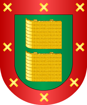 de gules, un castillo de oro, aclarado de azur, y 2º y 3º, en campo