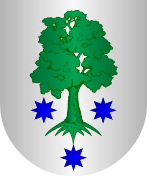 En campo de oro, un sauce de sinople y un jabalí de sable, pasante al