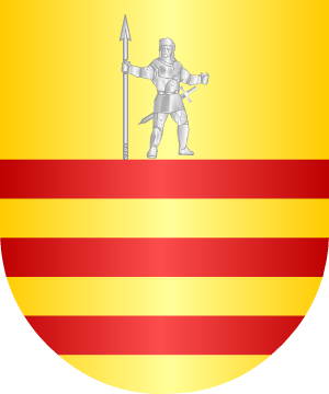 oro y gules, y un león rampante del uno en el otro. Bordura de azur,