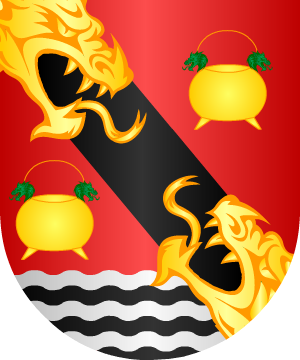 campo de gules, una banda de oro engolada en cabezas de dragones de oro. 2.- Después tomaron dos calderas de sable, una arriba
