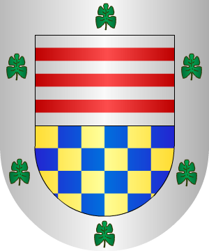 oro y gules, y un león rampante del uno en el otro. Bordura de azur,