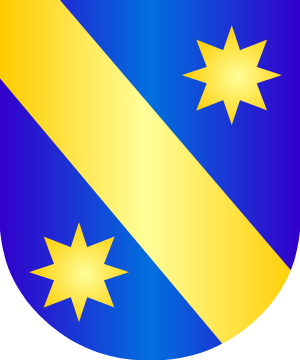 en campo de azur, una banda de oro, con dos flores de lis opuestas de color