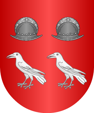 Escudo mantelado: 1º, en campo de gules, tres palos de oro; 2º, en