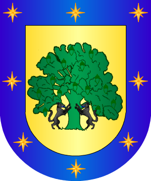 brazo un trozo de muralla de plata, y en lo bajo de un árbol de sinople,
