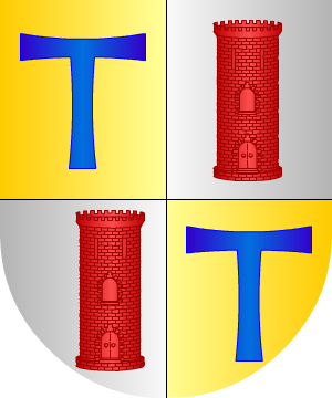 mazonada de sable. 23.- Otros de Cataluña: Escudo cuartelado: 1º y 4º, en campo de plata, una torre de gules, con la puerta de plata y mazonada de sable, y 2º y 3º, en campo de oro, un lambel con un pendiente de azur. 24.- Los Berenguer, descendientes de los Condados de Barcelona y Cerdaña, según Juan José Vilar y Psayla, traen: En campo de plata, dos cruces de San Jorge, cortinado de gules con tres bastones de oro. 25.- Otros Verenguer: En campo de oro, una encina, de sinople, con un lobo, de sable, alzado a su copa. 26.- Otros: Escudo partido: 1º, tres fajas, y 2º, un castillo. Bordura cargada de sotueres. Complemento de información de estos linajes complementada por cortesía de blasonari.net |