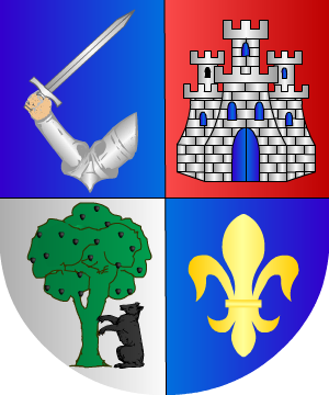 1.- Escudo de armas: Cuartelado; 1°, de azur un brazo armado de plata empuñado una espada de lo mismo; 2.° de gules un castillo de plata aclarado de azur; 3.° de plata, un moral de sinople frutado de sable con un oso también de sable, empinado al tronco; 4.°, de azur una flor de lis de oro.