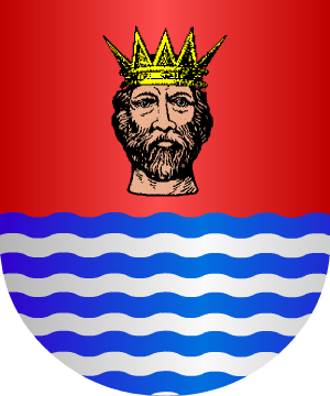 en campo de azur, una banda de oro, con dos flores de lis opuestas de color