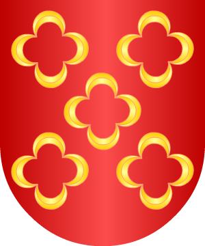 campo de gules, tres flores de lis de plata, y 3º o manteladura, en campo