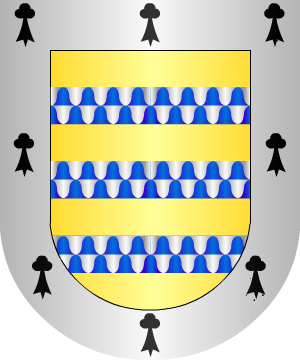 1º, de gules, con tres fajas jaqueladas de oro y sable, en dos órdenes,